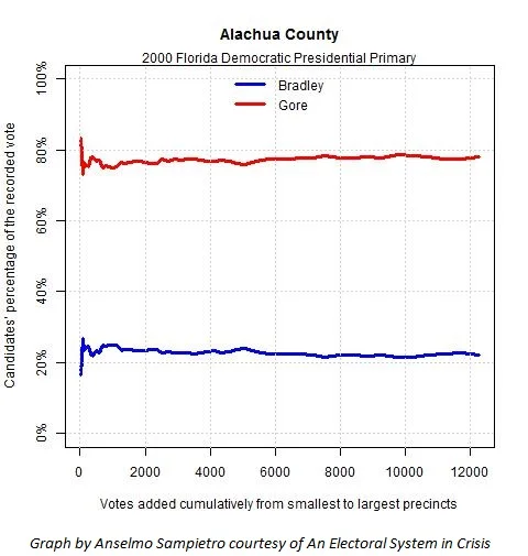 In the 2000 and 2004 presidential primaries in Alachua, Florida, each candidate’s share of the votes is roughly the same in small and large precincts.